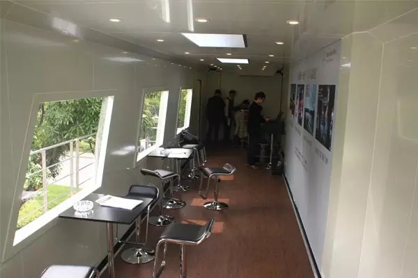 車廂里設置車輛展示區、品牌展示區、洽談區、舞臺區及休閑娛樂區等功能分區,空間布局雅致舒適,為您創造舒適與愜意的賞車與洽談空間。